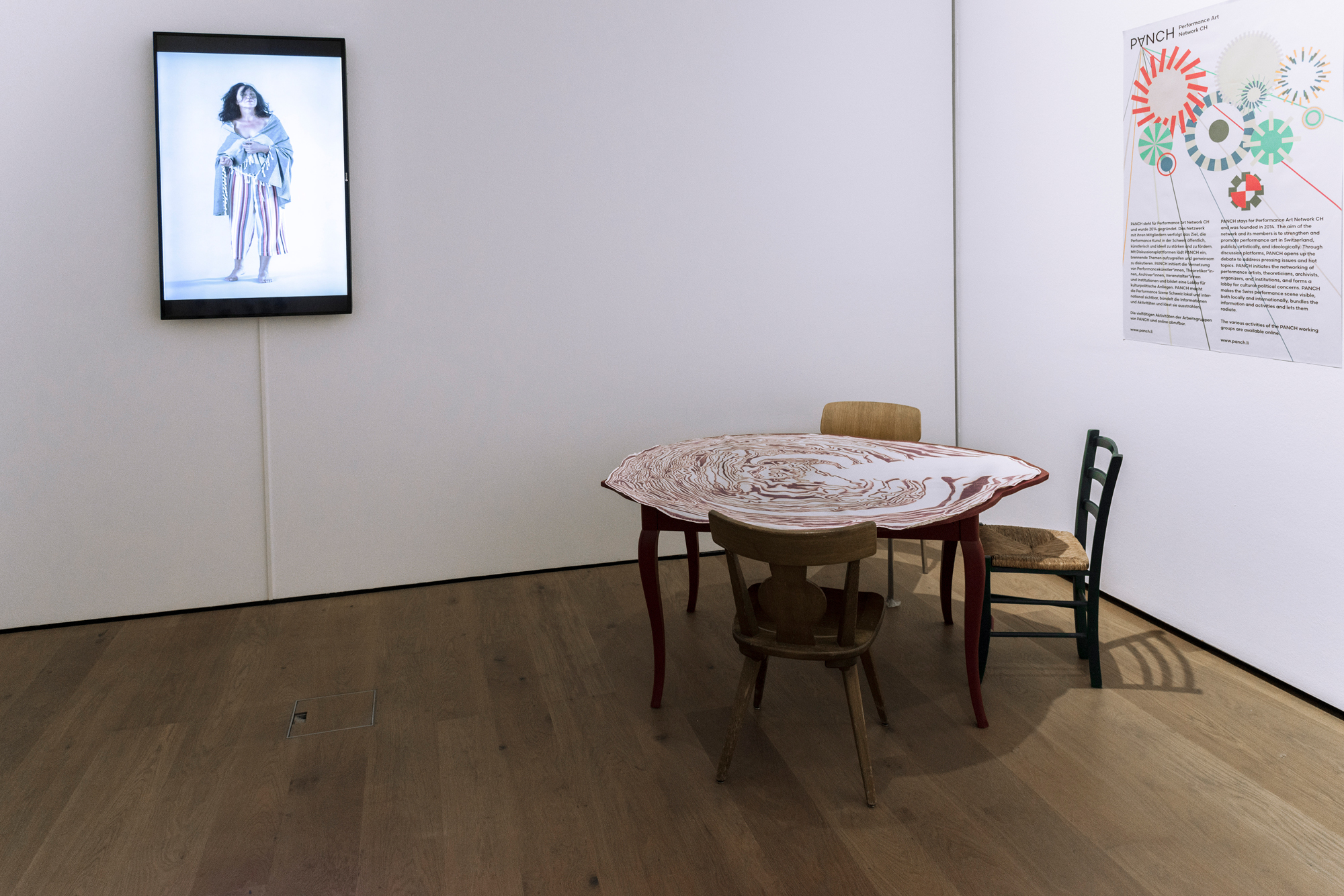 Die Ahnengalerie ist eine Porträtserie von Eliane Rutishauser mit Schweizer Performerinnen und Performern. Ziel ist es, die gegenwärtige Szene in ihrer Vielfältigkeit sichtbar zu machen. Eliane Rutishauser fotografiert Performance seit etlichen Jahren, aus verschiedenen Blickwinkeln und aus unterschiedlichen Anlässen: Als Künstlerin die selber performt, als Fotografin die Performance Anlässe dokumentiert und als interessierte Bildermacherin für eigene Projekte. In der Porträtserie interessiert sie das Sichtbar-Machen der Performanceszenen und die Pose zwischen der Darstellung und dem «Sich Zeigen».