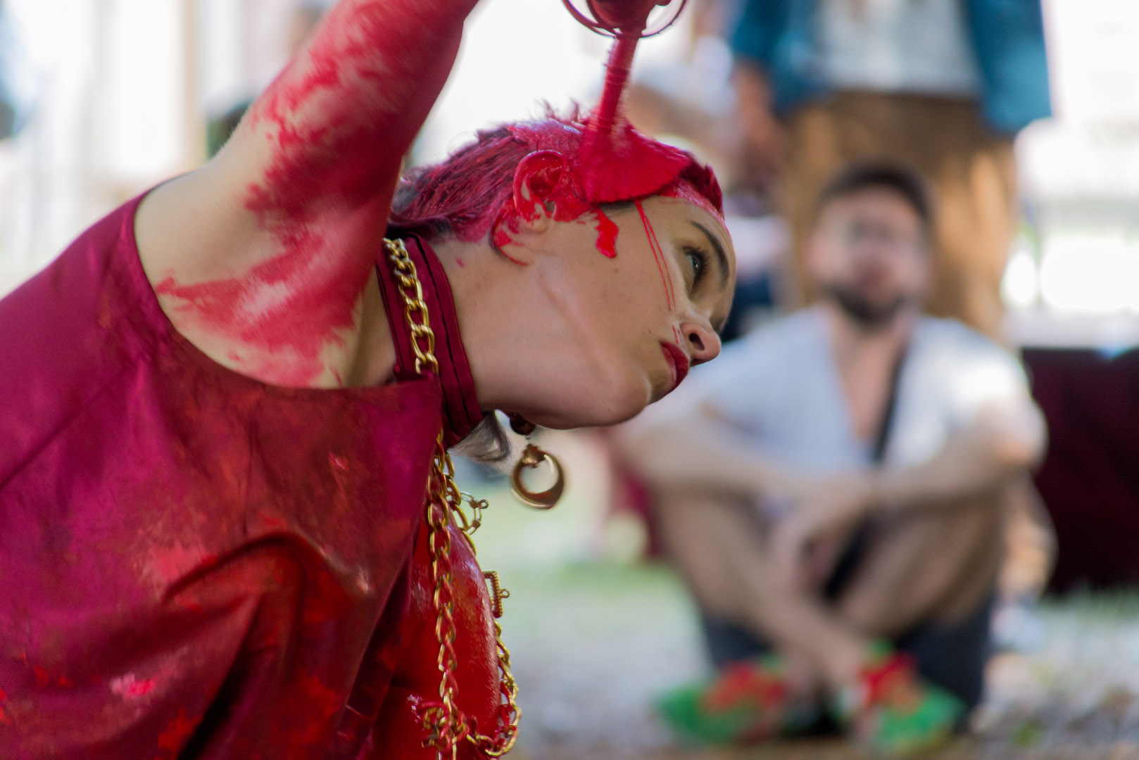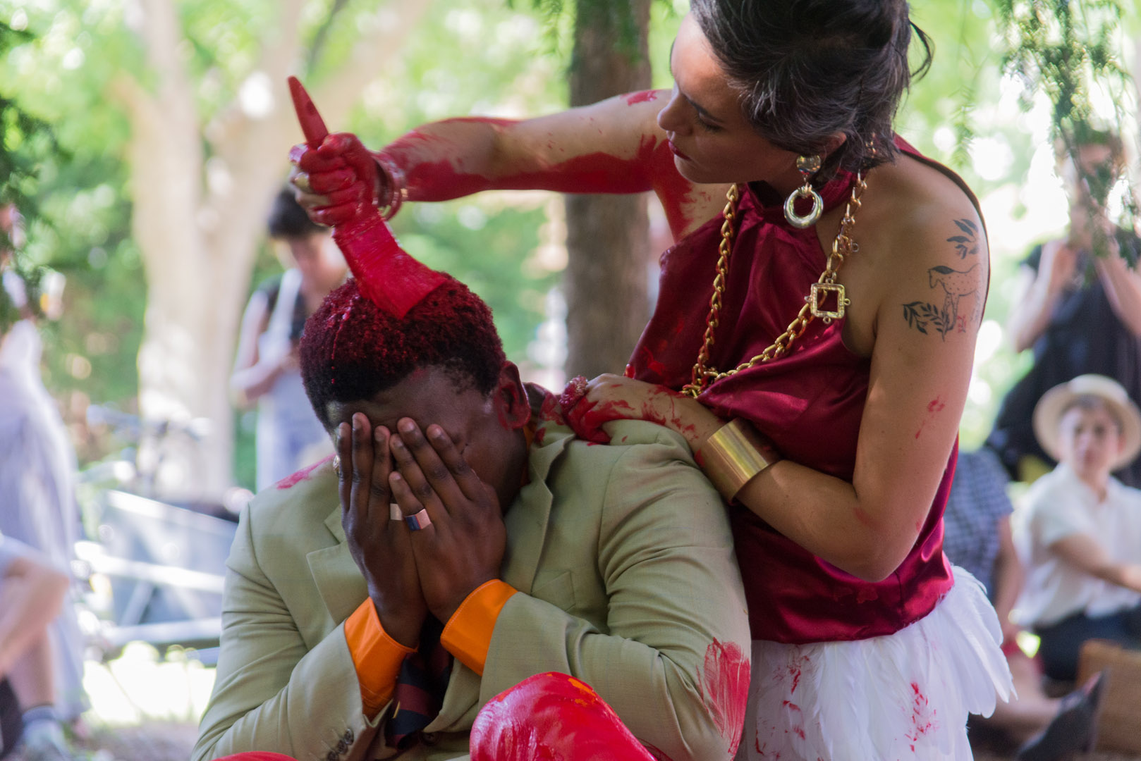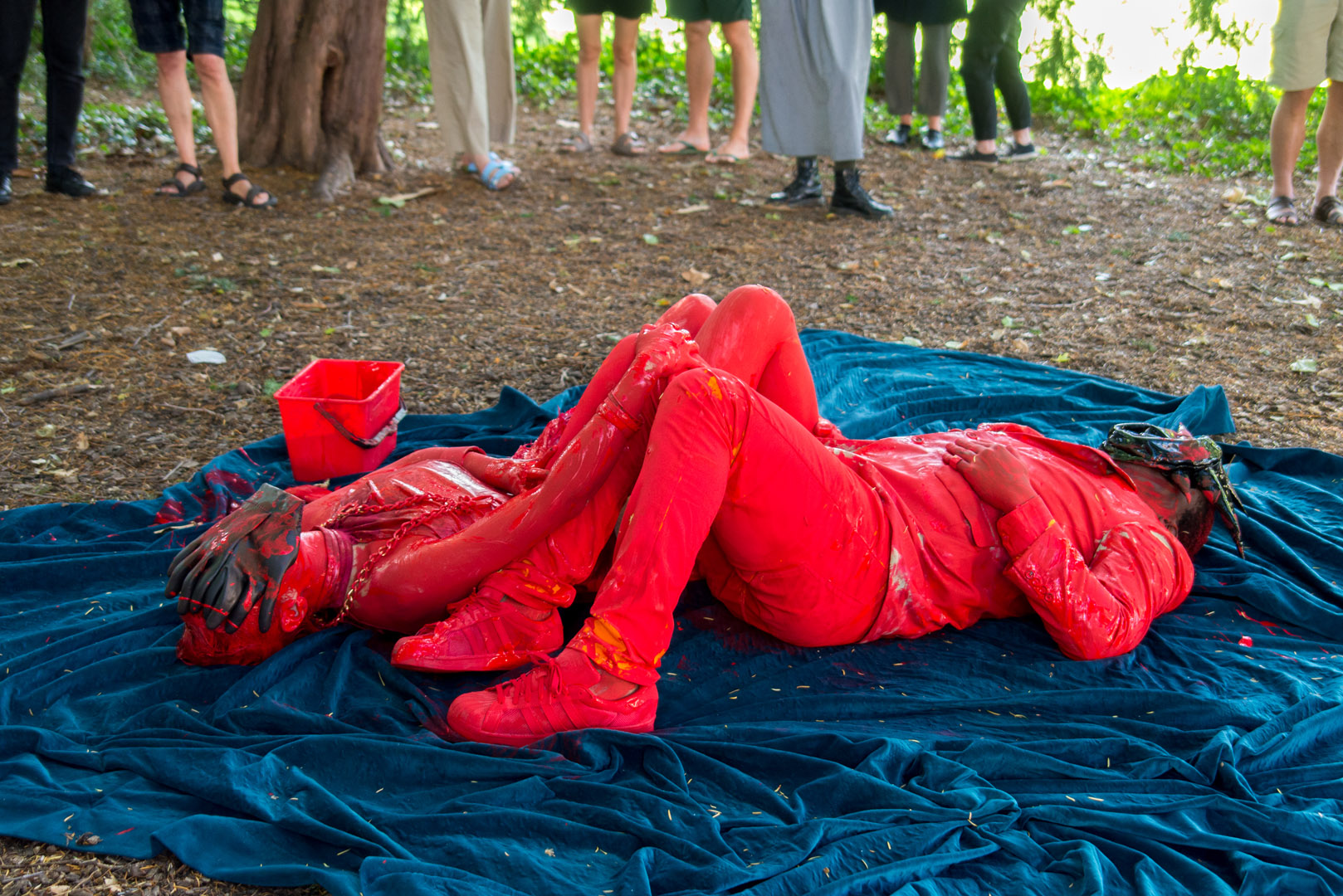 Ein ungewöhnliches Paar nimmt auf einem blauen Samtteppich in kostbarer Stille Platz. Sorgfältig und methodisch malt die Frau erst ihren Partner und dann sich selbst, bis auch die kleinste Spur ihrer jeweiligen Identität erstickt ist. Pièce distinguée Nº45 nimmt Anleihen bei den Ritualen der darstellenden Künste und der Kraft der Malerei, in einem subtilen Spiel der Auslöschung der Identitäten seiner Protagonisten.