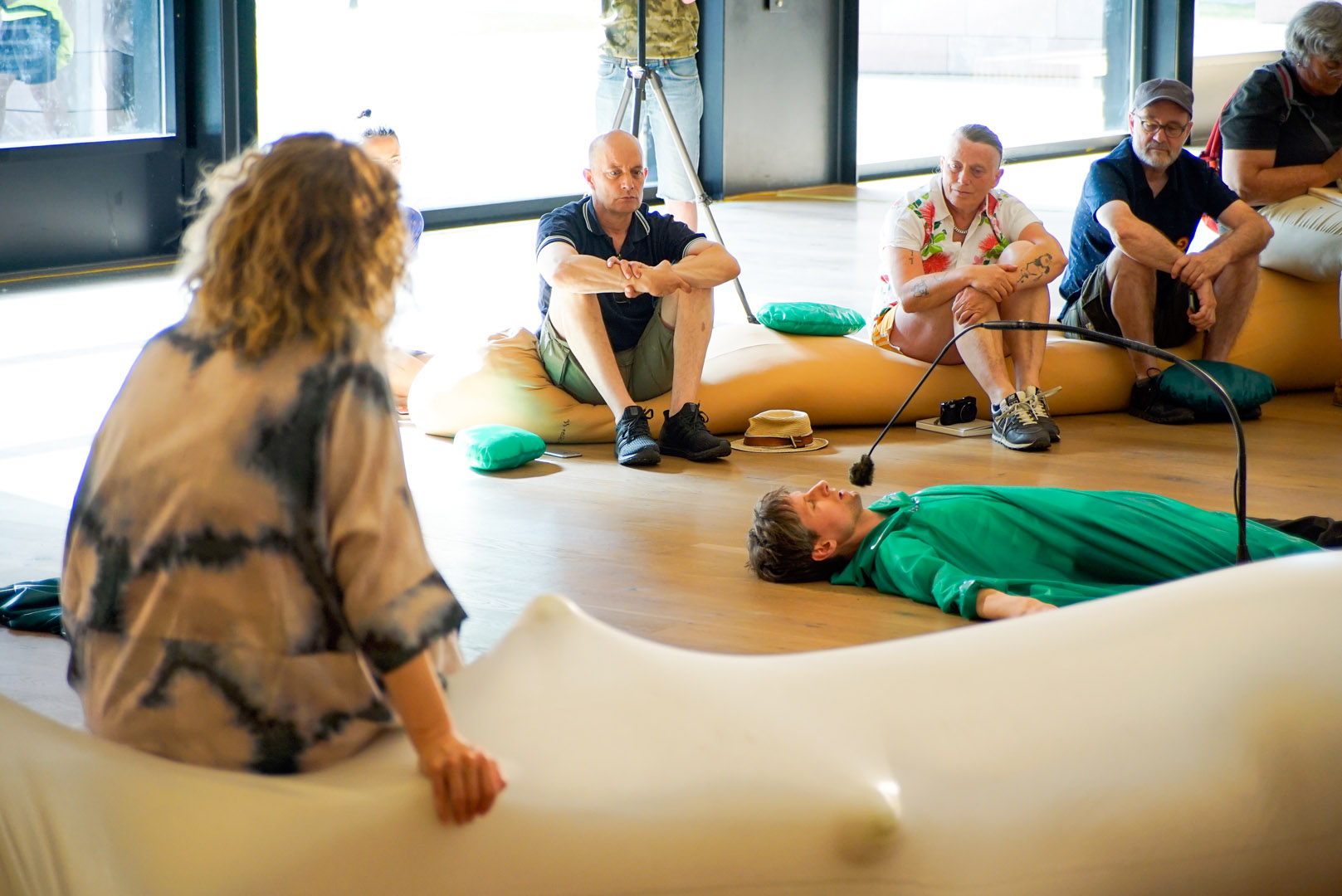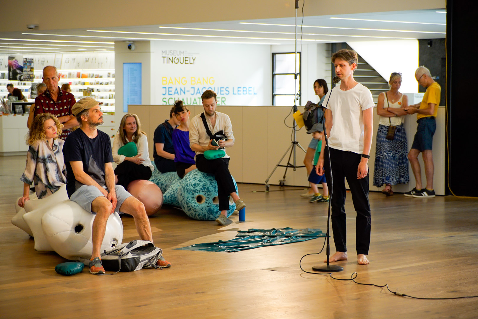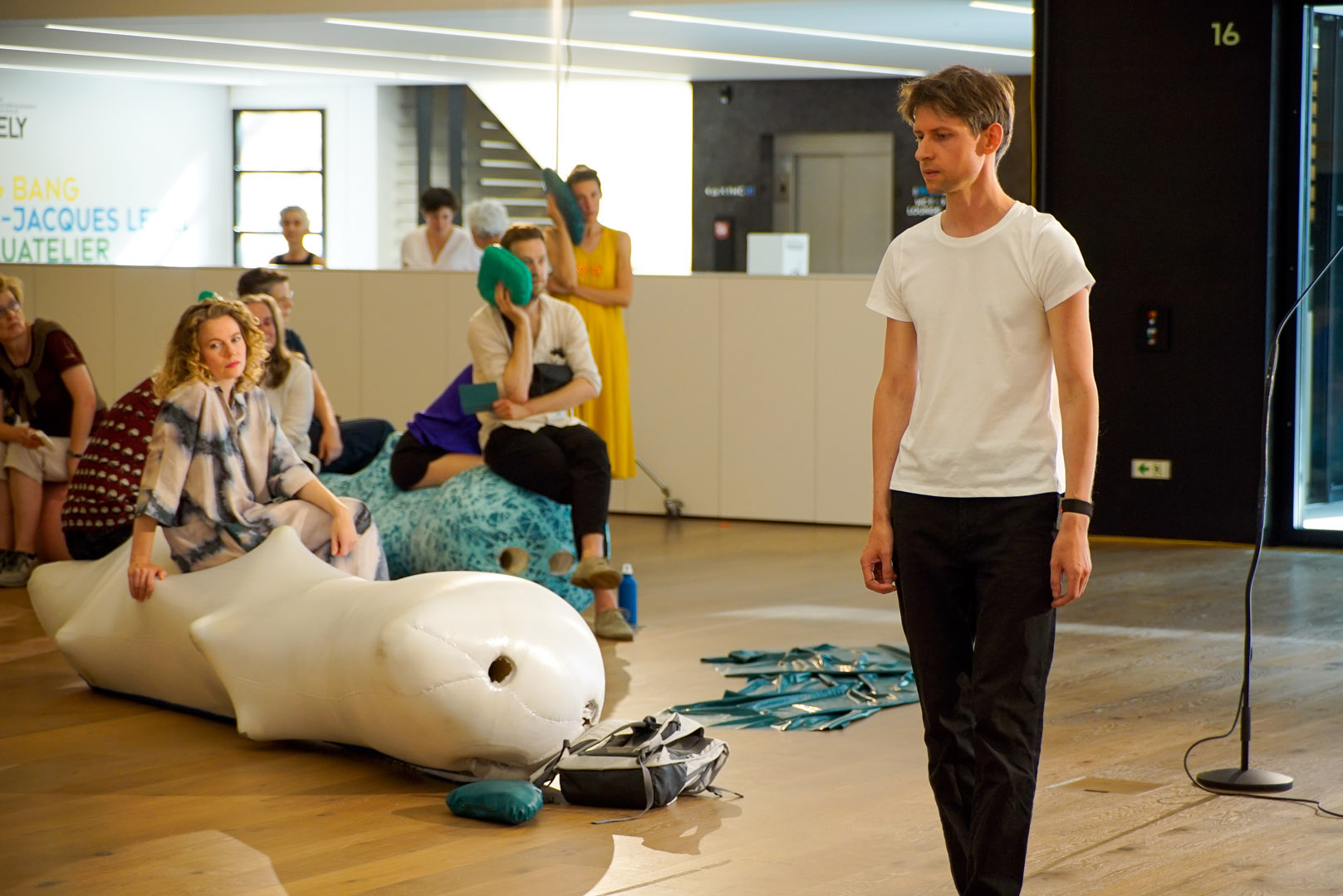 Aus einer fiktiven Unterhaltung zwischen Performer und virtuellem Sprach-Assistent entspinnt sich in „Bias Dialogs“ eine Polyphonie aus sprechenden und singenden Stimmen. Zwischen flauschigen Kissen aus Latex, filigranen Schwanenhals-Mikrofonen und zarten Schallwellen, zwischen Berührungen und Bewegungen verwandeln sich die Beziehungen der Akteure fortwährend. In einer Struktur aus Echos, Nachahmung und Wiederholung umkreist die Performance Themen wie Erinnerung, Taktilität, Fremd- und Vertrautheit und spürt dabei Resonanzen von Raum, Zeit, belebten und unbelebten Dingen nach.