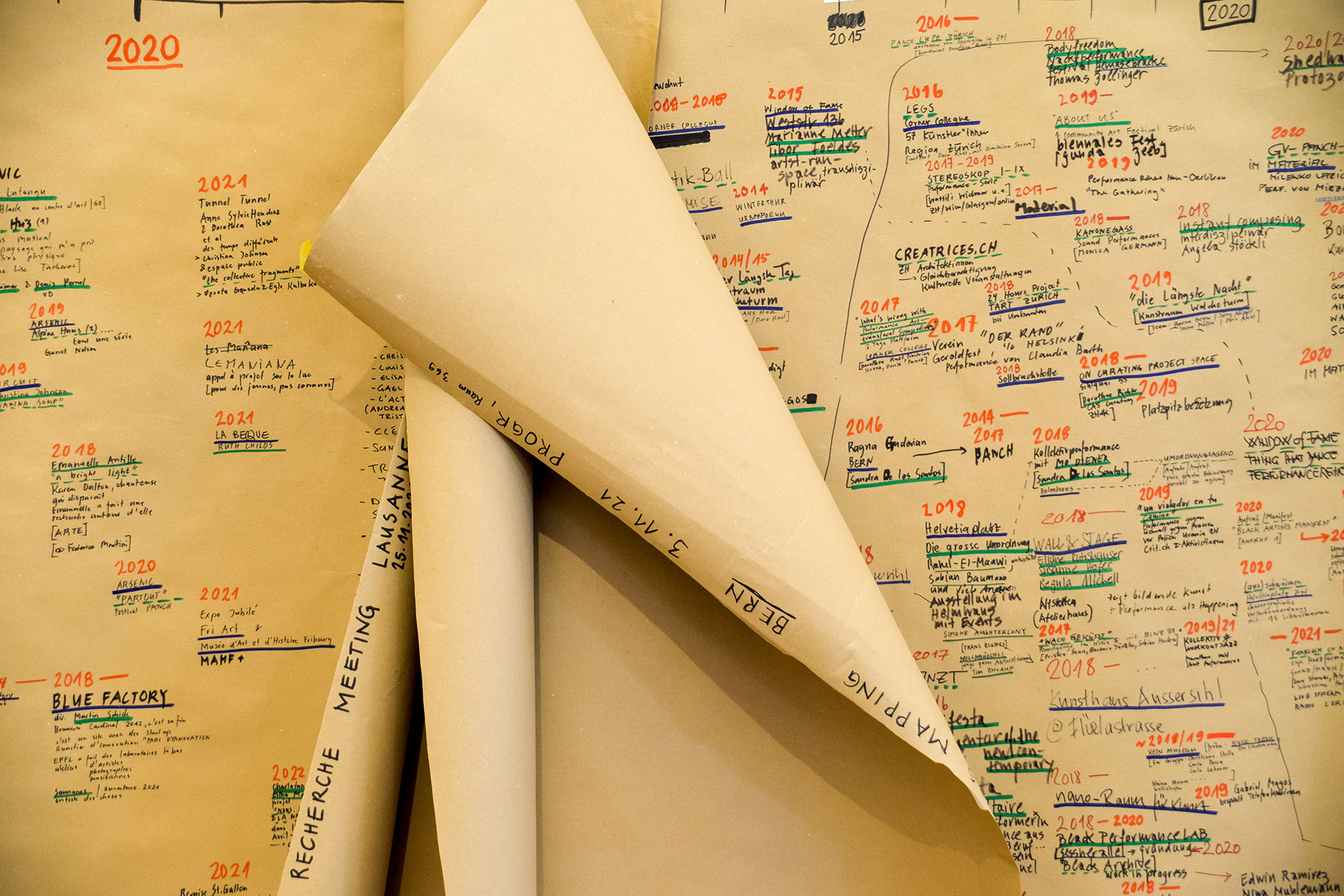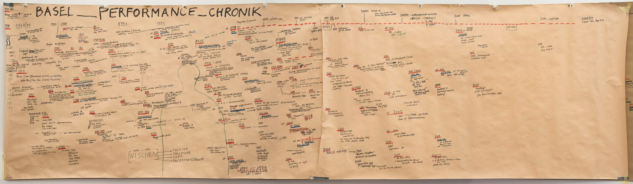 Im Vorfeld lud BANG BANG zu Recherchetreffen ein, an denen sich die jeweiligen Akteur:innen des lokalen Performancegeschehens versammelten. Ihre Erinnerungen wurden direkt auf grosse Mind Maps notiert. Diese Überblicksaufzeichnungen wurden wiederum von Ute Schendel fotografiert und sind hier einsehbar: